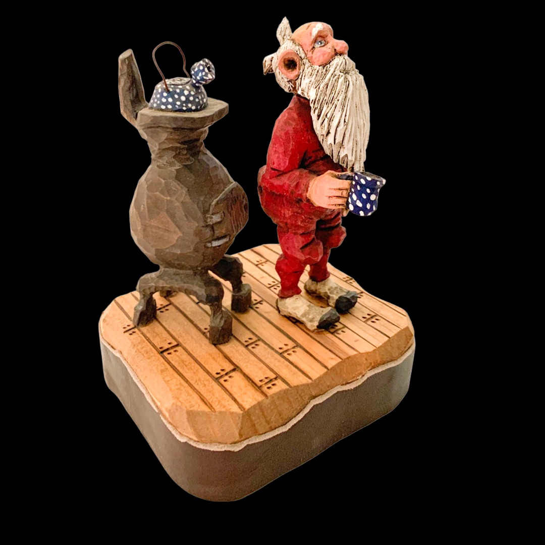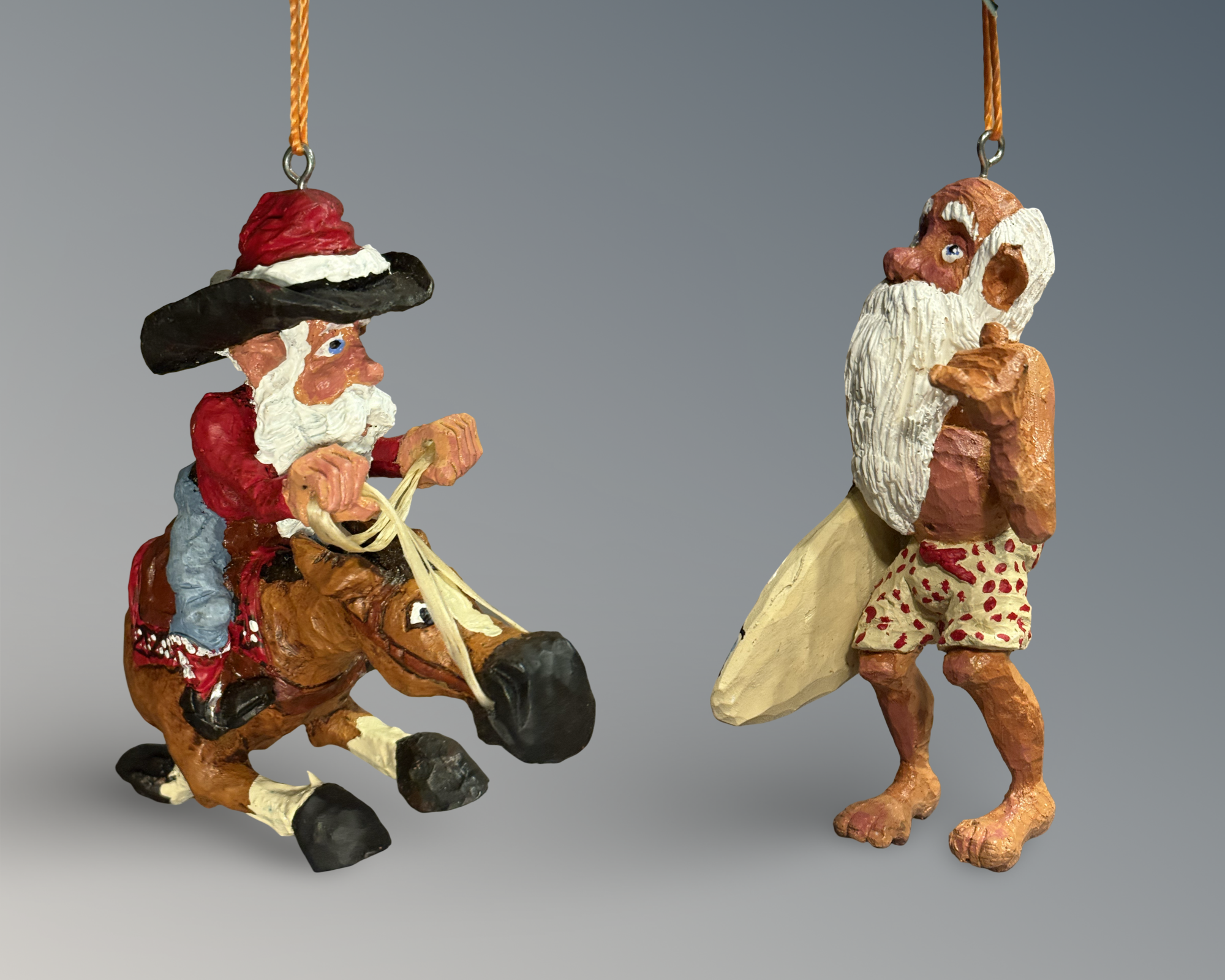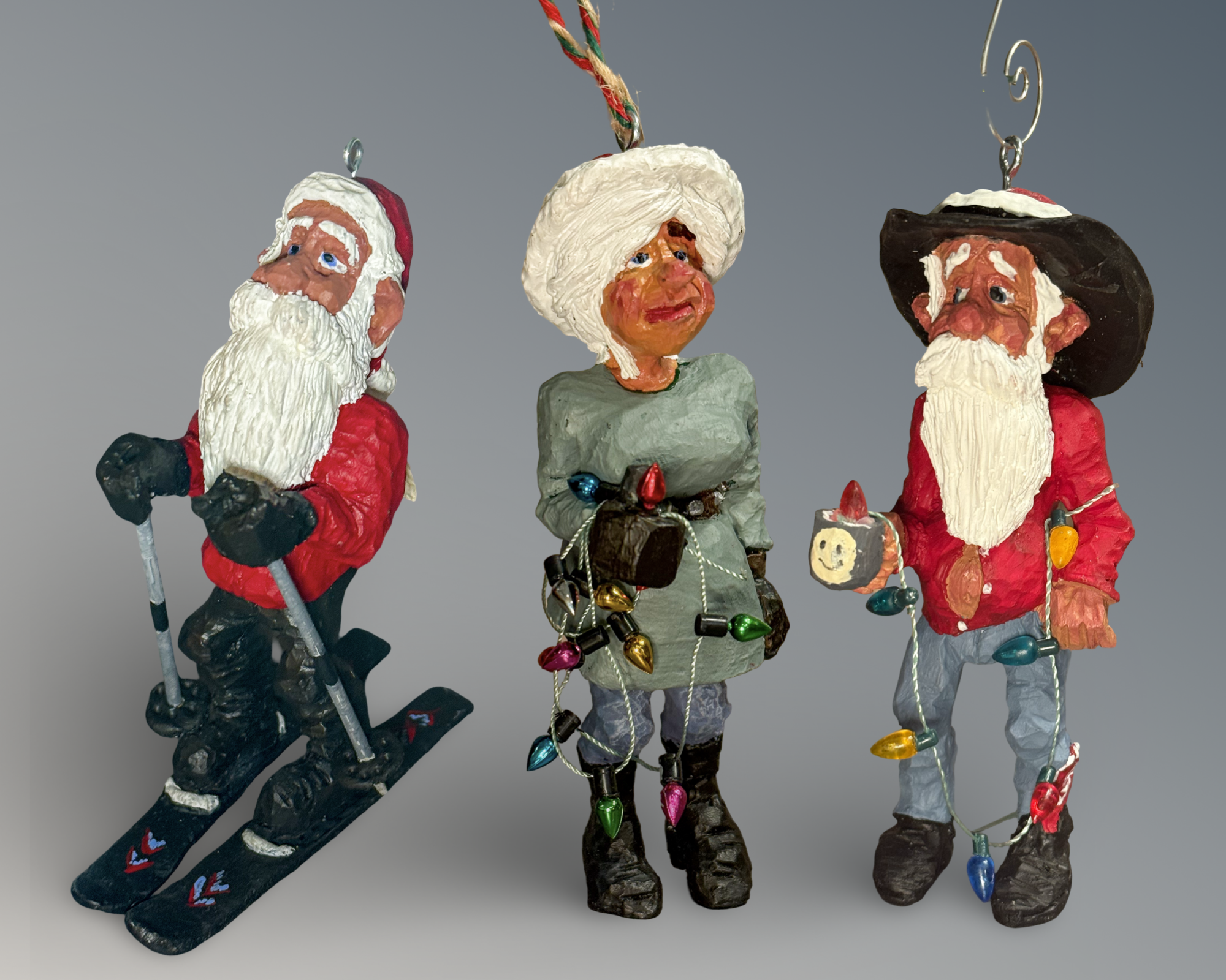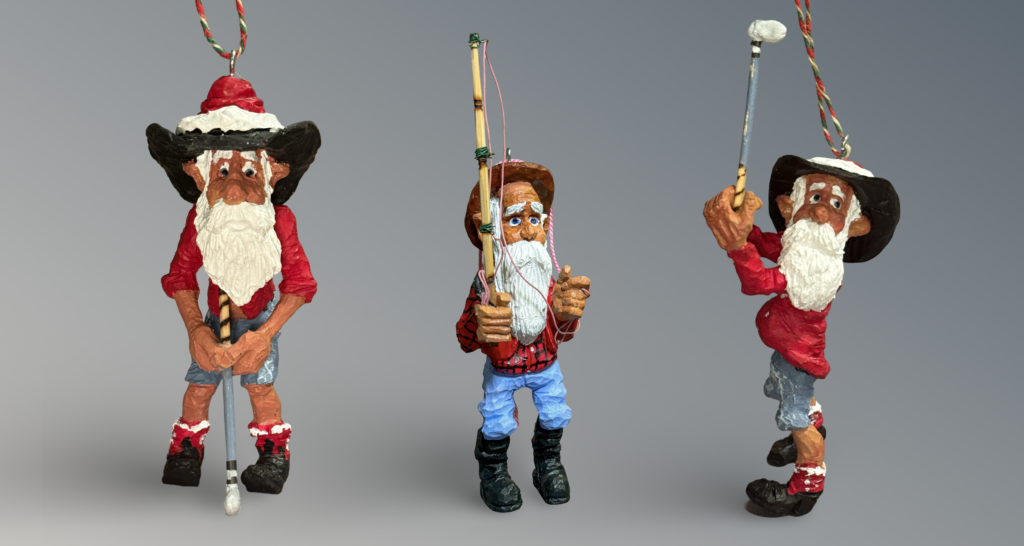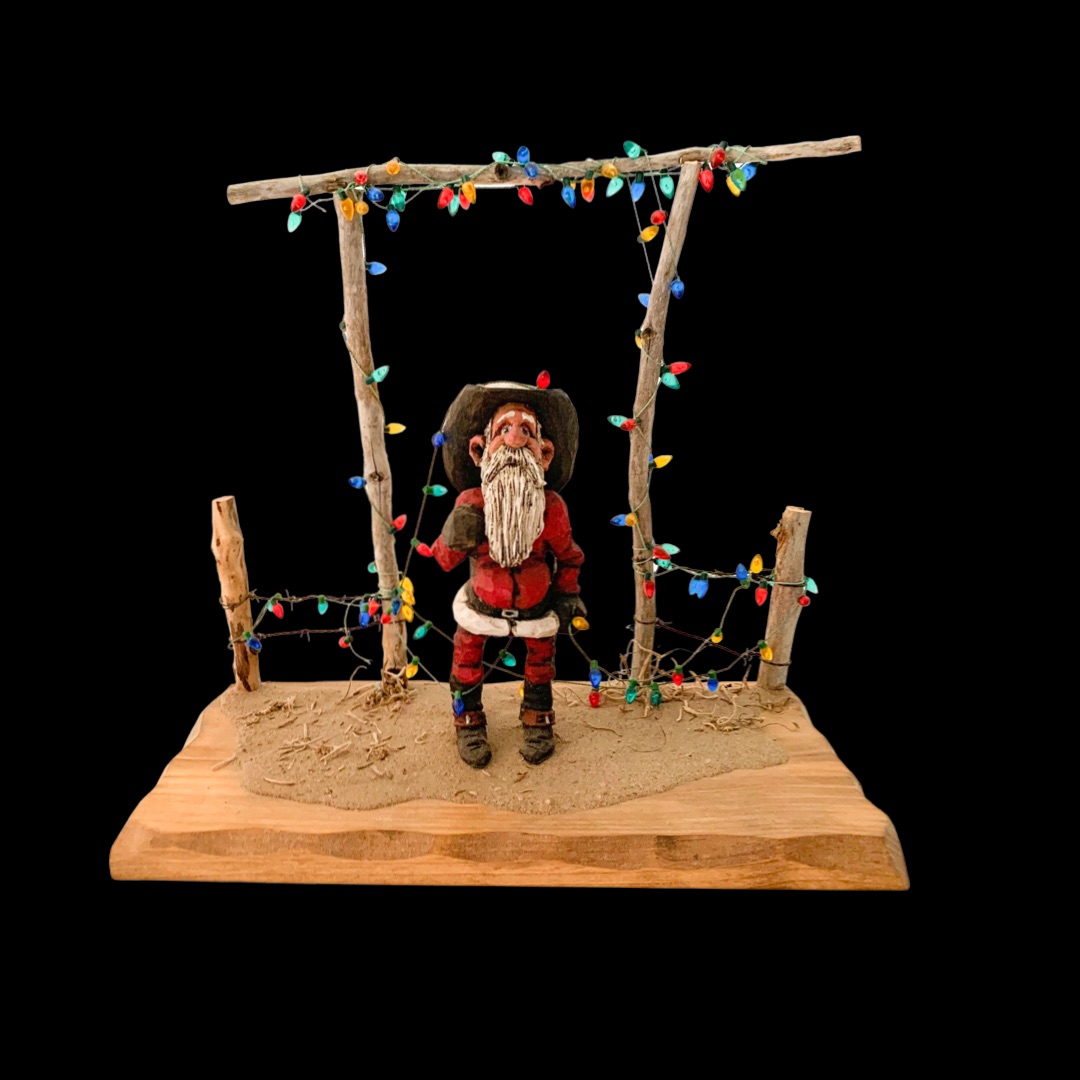 Cowboy Santas, rustic holiday carvings, and Western ornaments inspired by ranch-country Christmas traditions. Each design begins as a hand-carved original and is hand-cast in resin using Polly’s own molds, then individually painted for a unique finish