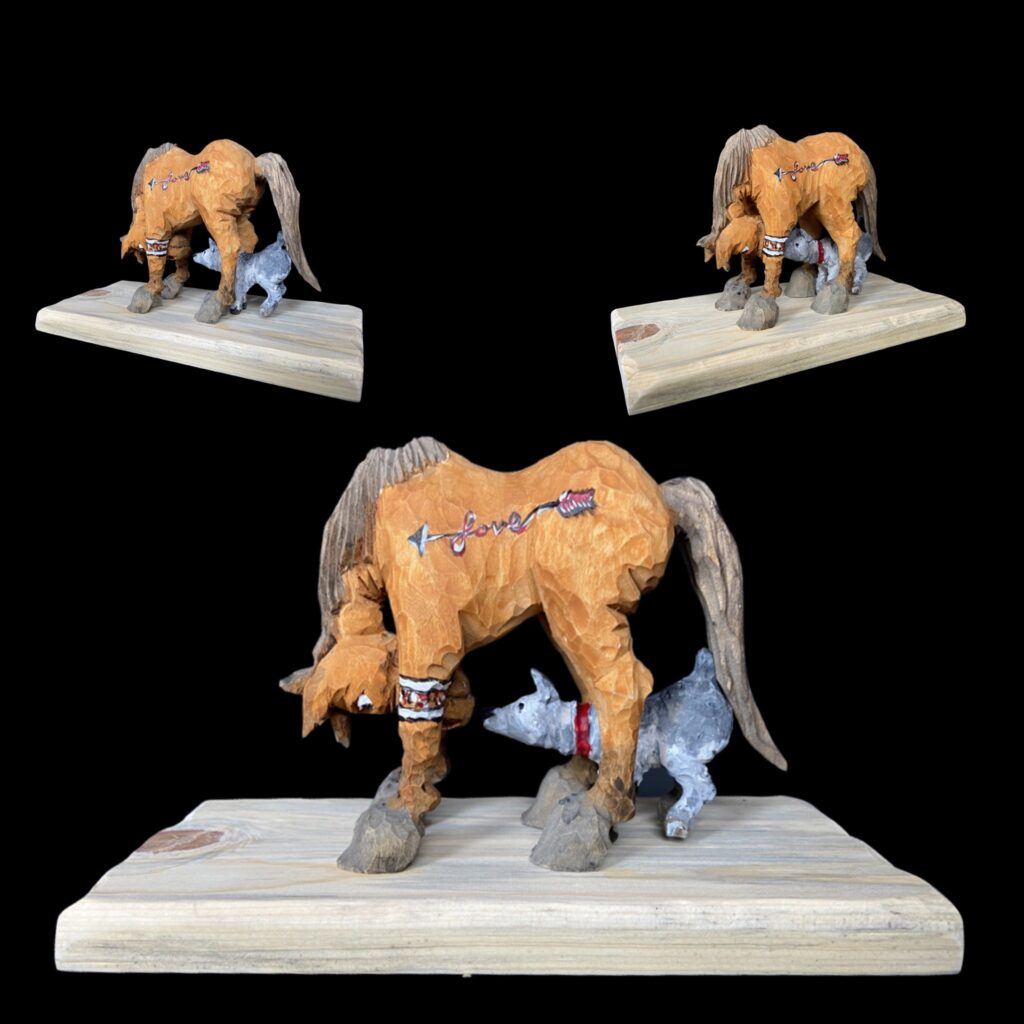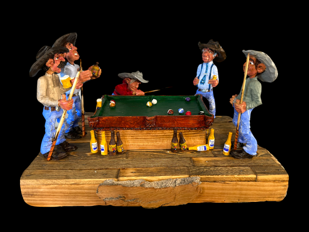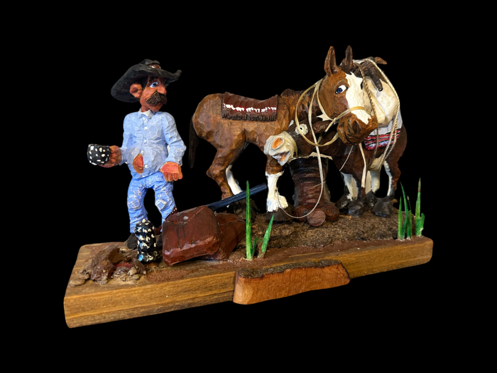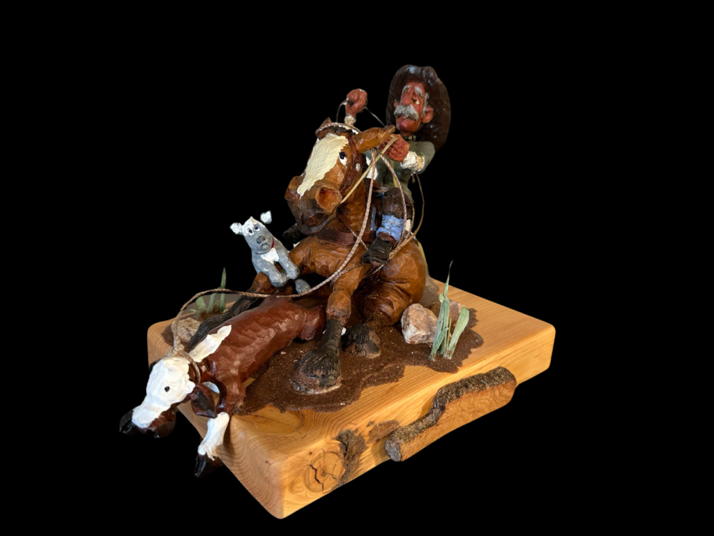 Carvings based on real ranch memories. Cowboys, working horse scenes, and Western humor. Original sculptures are hand-cast for collectors and finished with detailed painting that captures the grit and warmth of Western life.